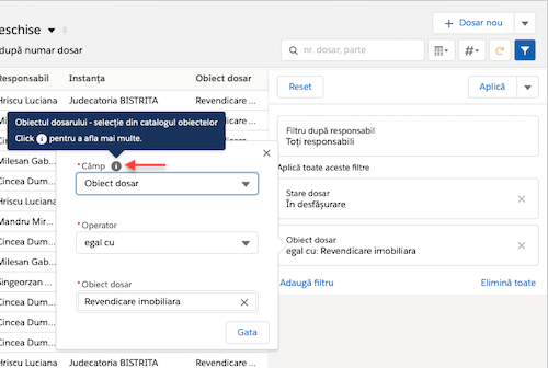 - filtru pe interval calendaristic (2 valori de tip dată calendaristică): adăugat operatorul conține anul. Ex: Dosare active în anul 2019 = Cauză perioada